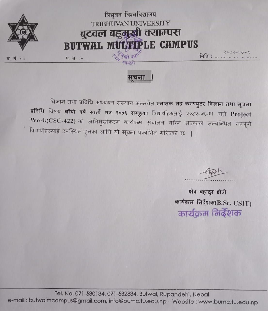 B.Sc.CSIT विषय २०८२ काे विद्यार्थी भर्नाकाे दाेश्राे तथा पूर्ण सूची सम्बन्धी सूचना
